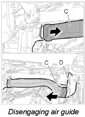 1. Disengage air guide -C- at the heater/air-conditioning unit and at the air guide -D-.