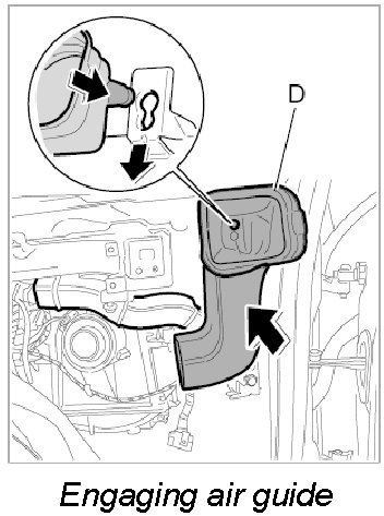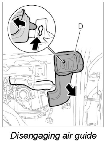 3. Disengage air guide -D- by pulling it upward at the mounting bracket, and pull it out in a downward direction to remove it.