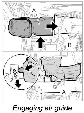 3. Slide the air guide -A- into the air guide slot -B- and engage air guide -A- at the mounting bracket.