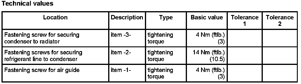 2. Engage the condenser on the radiator bracket and secure with the fastening screw -3-. - tightening torque: 4 Nm (ft. lbs.)(3)