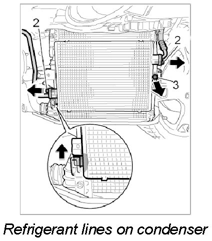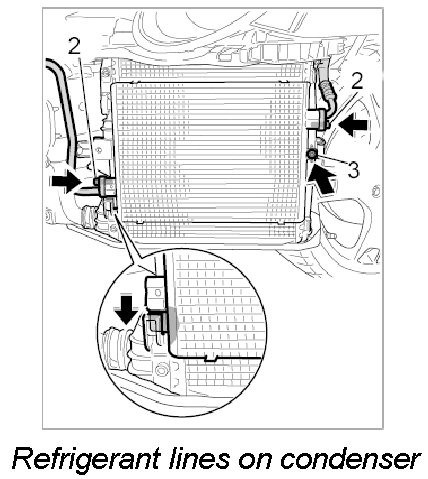 INFORMATION: When loosening or tightening the M8 refrigerant lines on the condenser, always counter with a 21-mm open-ended wrench.