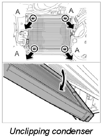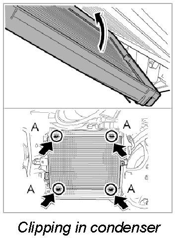 5. Unclip the condenser from the four brackets -A- and lift it out of the retaining bracket -arrow-.