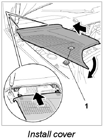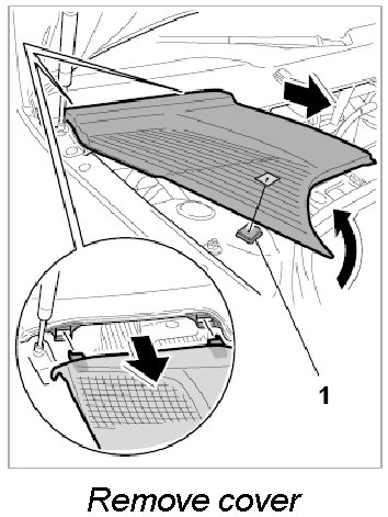 1. Lift rubber lip of luggage compartment seal to one side, lift up the cover and disengage it from cowl panel cover.