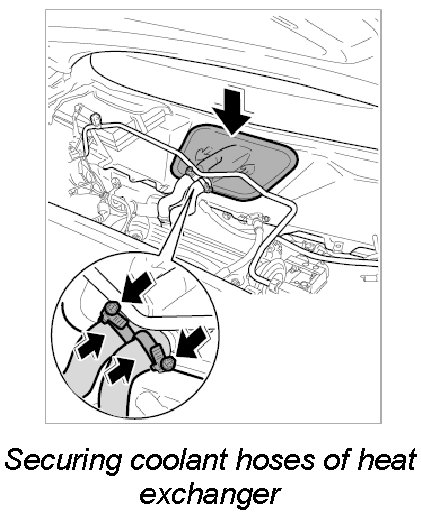 1. Release the two top fastening clamps for the coolant hoses of the heat exchanger and slide them back over the hoses.