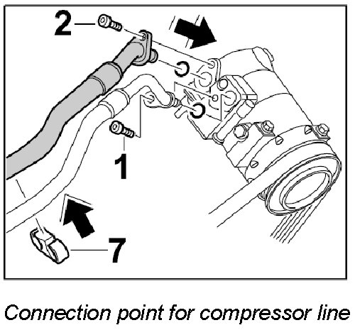 3. Push line into the compressor, secure with the fastening screw -1- and clip line into the support. - Tightening torque: 21 Nm (16 ft. lbs.)