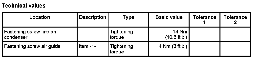 1. Carefully push the lines into the condensers and screw tight with the fastening screws. - Tightening torque: 14 Nm (10.5 ft. lbs.)