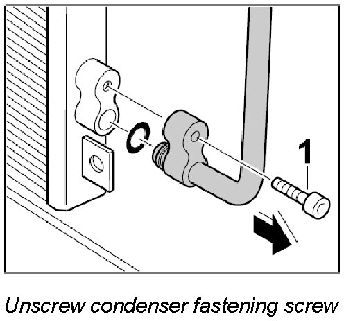 4. Unscrew the fastening screws -1- of the line condenser-condenser and pull the line out of both condensers.