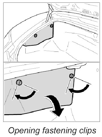 1. Open luggage-compartment lid, turn the two fixing clips at the side by 90 degrees and fold down the luggage compartment cover.