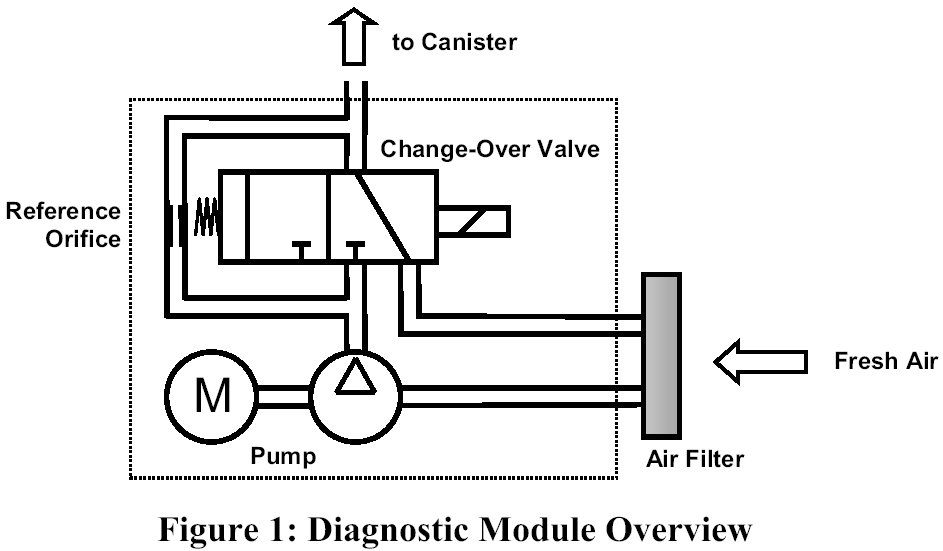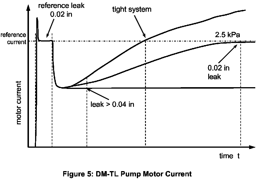 The DM-TL (Diagnostic Module Tank Leakage) is used for monitoring the evaporative system for small (> 0.02 in) and rough (> 0.04 in) leaks. It consists of an electrically driven air pump, a change-over valve and a 0.02 inch orifice for reference measurement - see Fig. 1. The tightness of the tank system is obtained by comparing the actual air pump's motor current with that measured when the system is operated with a standardized reference orifice.