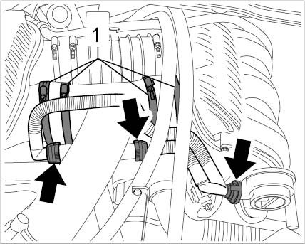 2. Remove crankcase vent line at distributor pipe and oil separator. To do this, release and pull off rapid action couplings -arrows-.