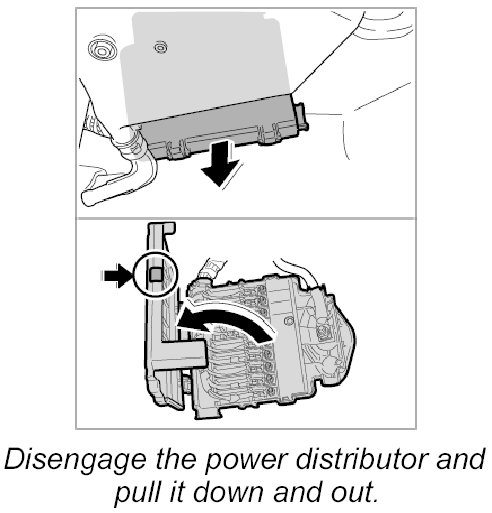 5. Pull the power distributor away from the firewall and lower it down into the passenger's footwell.