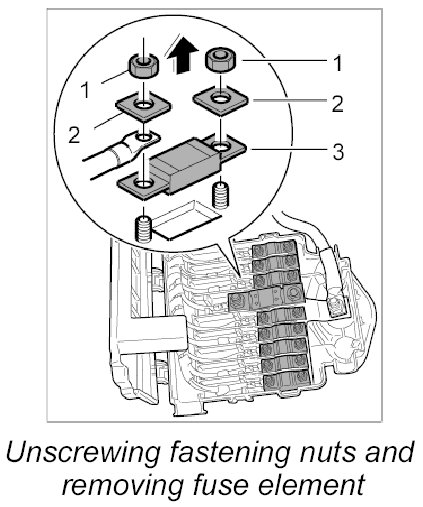 9. Unscrew the fastening nuts -1-, remove the washer -2- and take out the fuse element -3-.