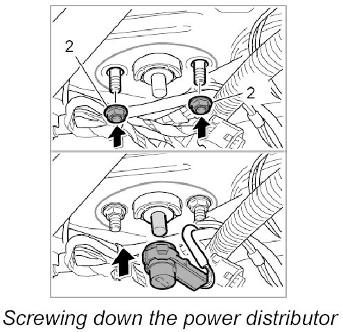 7. Screw down power distributor with the two fastening screws -2-. - Tightening torque: 11 ft. lbs.
