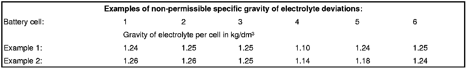 Example 2: The gravity of electrolyte in cells 4 and 5 is too low. The specific gravity of electrolyte deviations between the battery cells is greater than 0.03 kg/dm³.