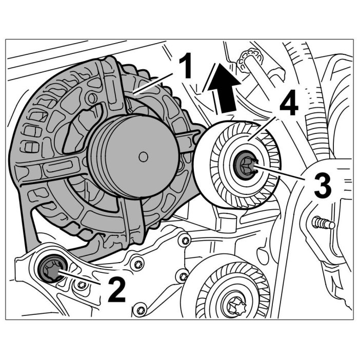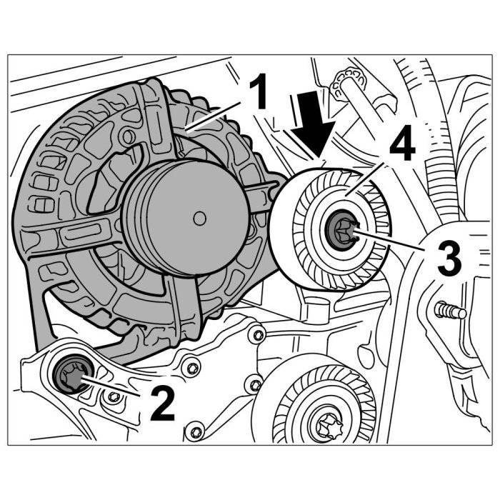5. Insert and position fastening screw -3- and deflection roller -4- in generator -1-.