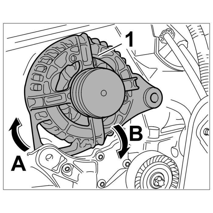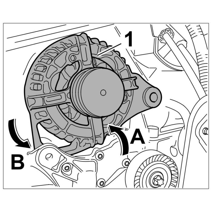 4. Turn generator -1- in an anticlockwise direction -arrow B- until the holding arm fits into its installation position behind the lug.