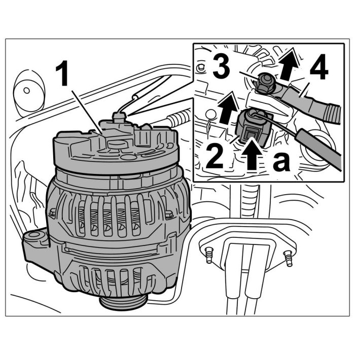 7. Unscrew fastening nut -3- for the B+ lead -4- and remove the B+ lead -4-. Remove generator -1-.