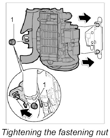 1. Engage the fusebox on the support and secure with the fastening nut -1-. Ensure that the electrical lines are not trapped or installed live. - Tightening torque: 9.7 Nm (7 ft. lbs.)
