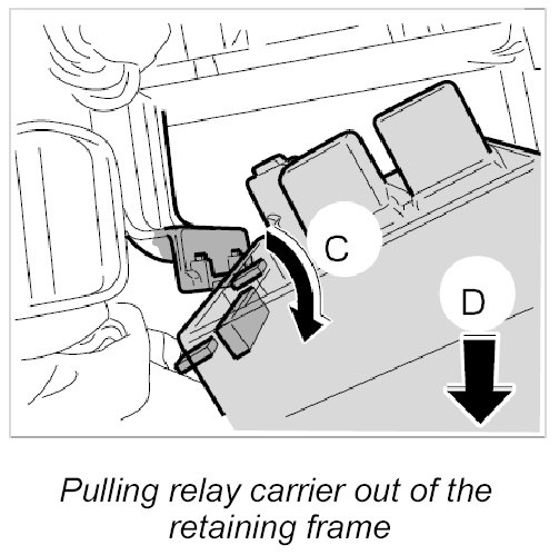 3. -C- Pull out the support lugs of the relay carrier from the support and -D- pull out the relay carrier downward.