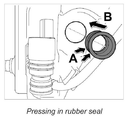 1. Apply a suitable rubber lubricant (tyre mounting paste) to the sealing surface -arrows A- and press the rubber seal into the tank -arrow B- until it is felt to engage.