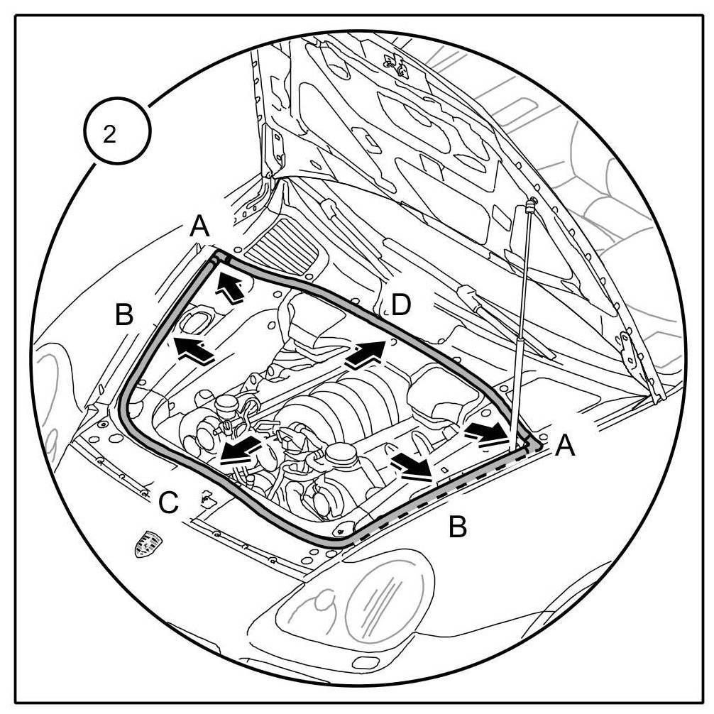 2.3. Position and press the seal without any tension on the flanges to the wing -B- , lock mount -C- and plenum chamber cover -D-.