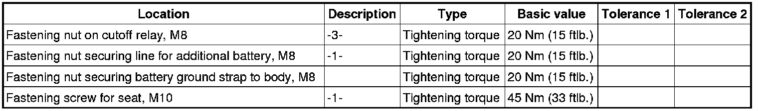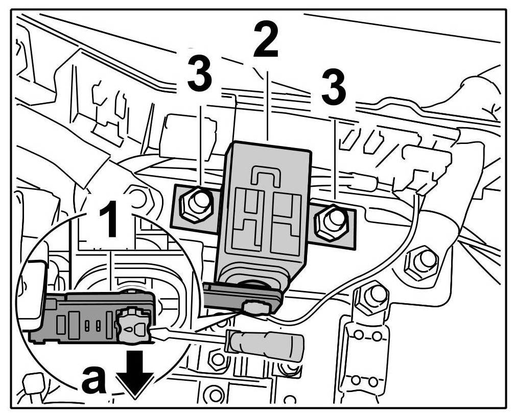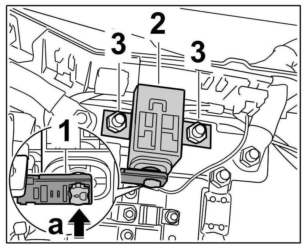 1. Position the cutoff relay -2- in the power distributor. Screw on the two fastening nuts -3- on the cutoff relay. => Tightening torque: 20 Nm (15 ftlb.)