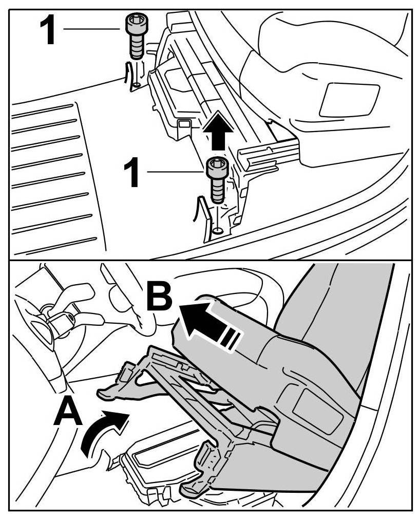 2. Move the seat in its folded position towards the rear -arrow A- and then tip it forward -arrow B-.