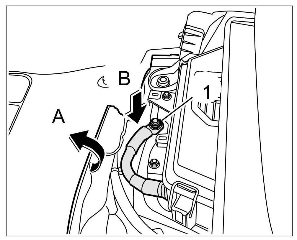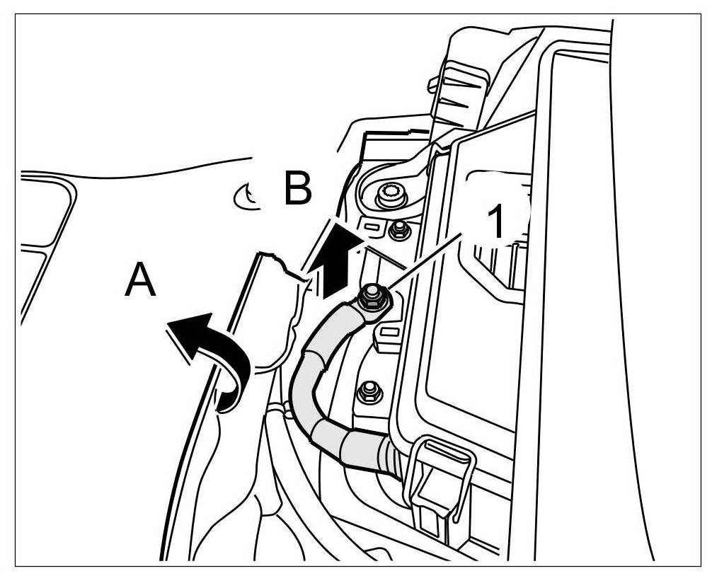 1. Fold carpeted floor forward -arrow A- , place battery ground strap on the body -arrow B- and secure with the fastening nut -1-.=> Tightening torque: 20 Nm (15 ftlb.)