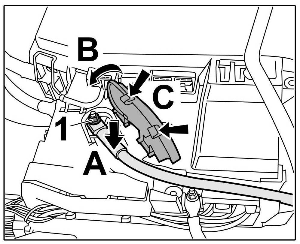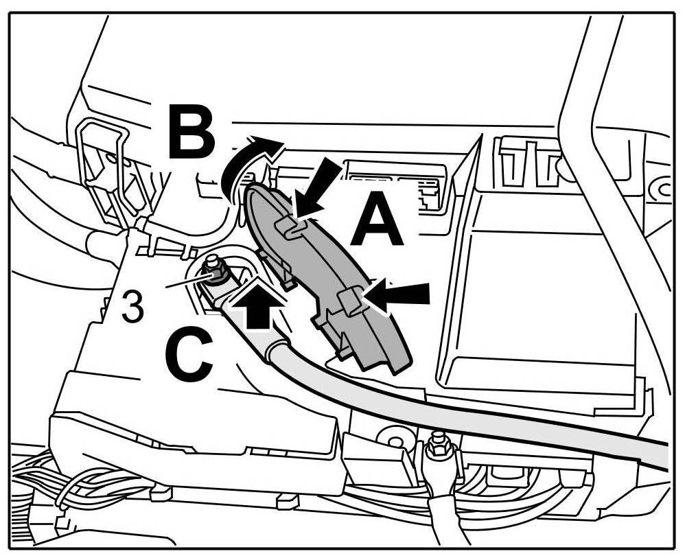 9. Screw off the fastening nut -arrow 3- and remove the line for the additional battery -arrow C-.