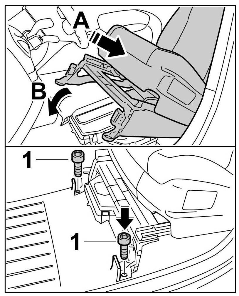 6. Press the front seat trim down -arrow B- until the locking lugs engage securely on the seat frame.