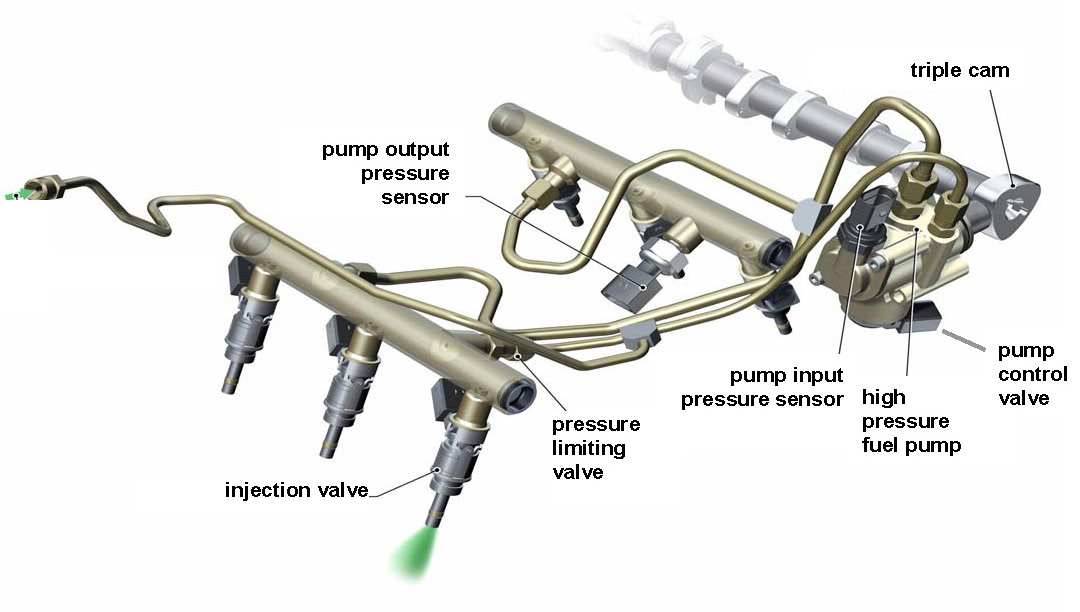 The electrical controlled, mechanical-driven high pressure fuel pump provides the injection pressure. The fuel pressure sensor and the control valve in the high pressure system control the high pressure between approximately 3 and 11 MPa. The target pressure depends mainly on engine speed and torque request.