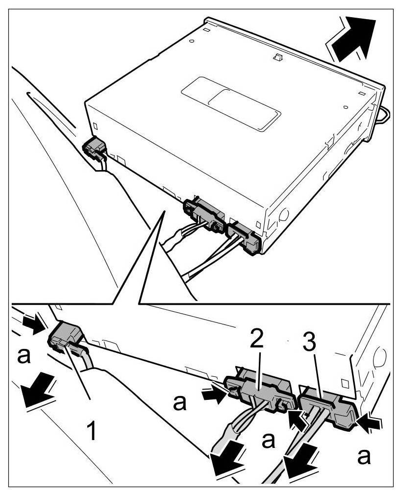 5. Unlock the electric plugs -1, 2, 3- on the navigation unit -a- and remove the navigation unit.