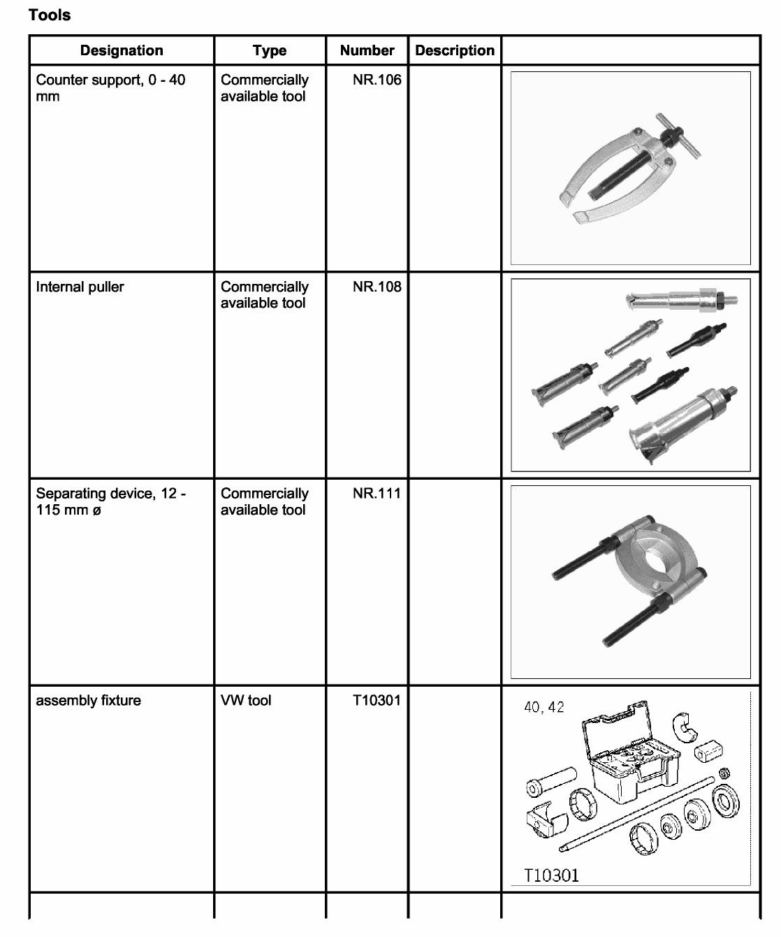 Tool overview for chassis subframe bearings