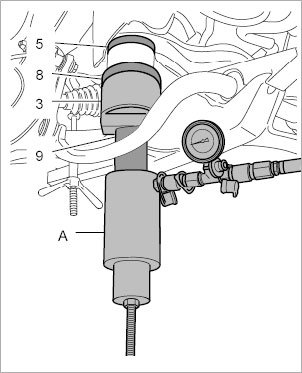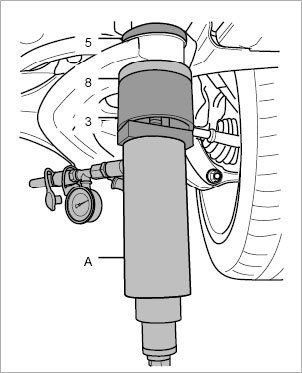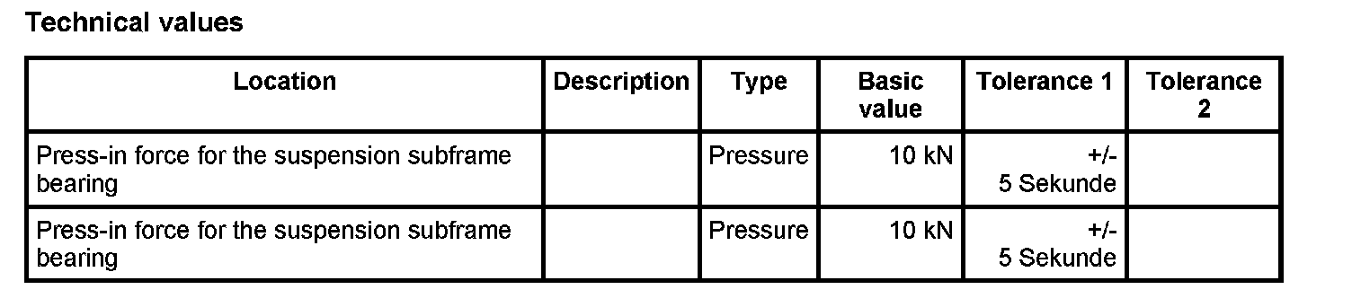 8. Press in suspension subframe bearing. To avoid damaging the bearing, the maximum - Pressure: 10 kN±5 Second must not be exceeded at the stop (10 KN = 350 bar). This conversion applies only to the hydraulic cylinder VAS 6178. The conversion depends on the diameter of the cylinder in question.