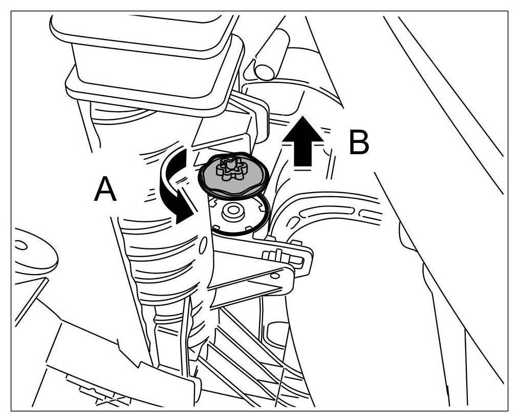 5. Place rubber stopper on plug -arrow A- and screw in -arrow B-.