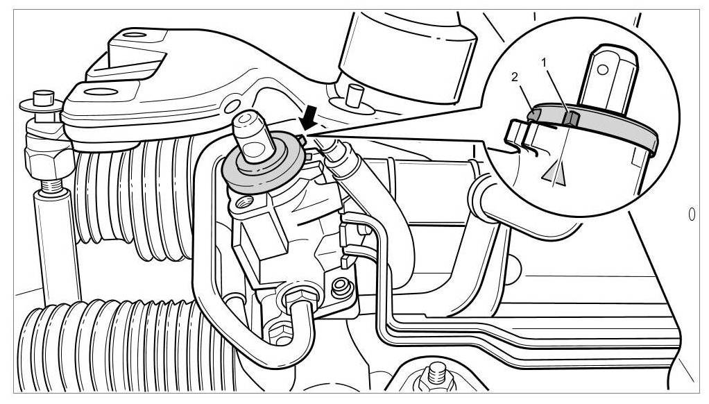 6. Afterwards, adjust front wheel alignment if necessary until marking on steering housing (triangle) is aligned with the marking lug -1- of the driver.