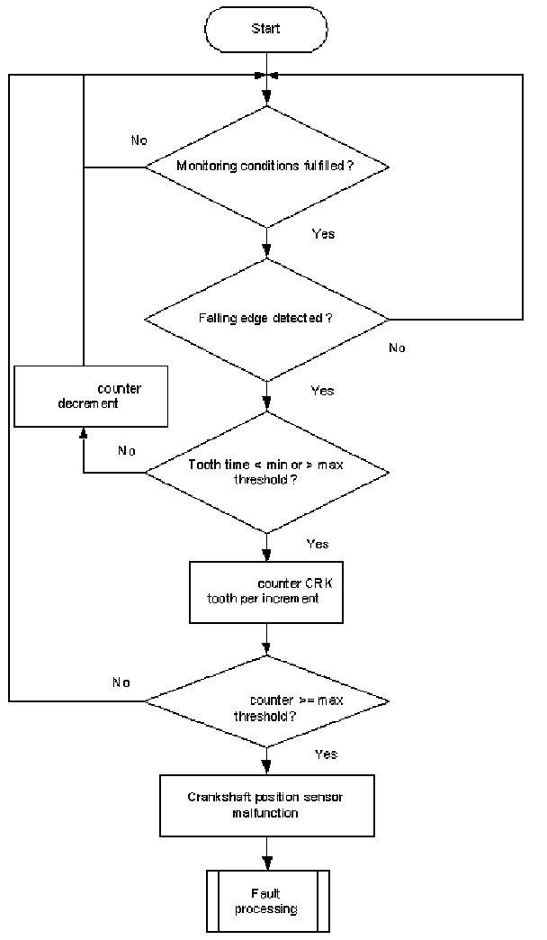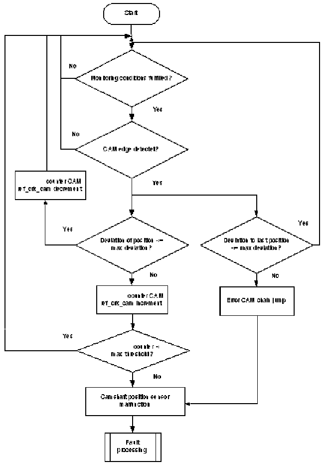 A teeth counter is incremented at every falling edge of the CRK sensor signal. If plus or minus one tooth is detected Flowchart diagnosis of mechanical reference position and diagnosis of chain jump. 360 °CA at the reference gap, the tooth number counter will be incremented. If the counter exceeds a limit, a CRK tooth error is delivered to the error management. If more then one tooth plus or minus is detected the CRK looses synchronization and a CRK sync counter will be incremented. If the counter exceeds a limit, a CRK sync error is delivered to the error management.