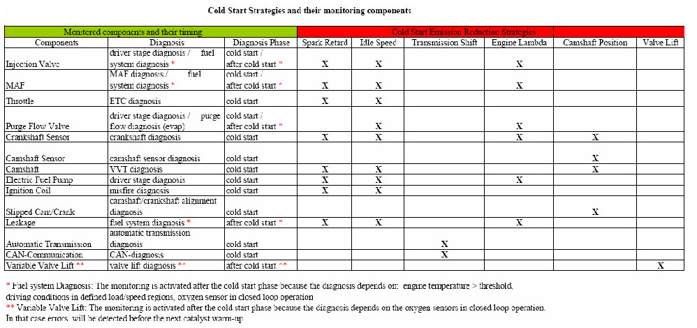 According to (e)(11.2.1), the individual component related to the above strategies has to be monitored. The table below demonstrates that all catalyst heating measures are covered by components which are monitored individually. The long term fuel system and the valve lift diagnosis, which need a lambda signal for monitoring, are finished after the catalyst warm-up phase. Errors will be detected before the next catalyst warm-up.