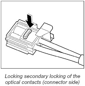 The LWL and the plug connections must not come into contact with fluids such as water, creeping compound, preservative, anti-freeze protection, cleaning agent. They will impair the MOST system functions or cause complete system failure. Even plug connectors with plugged-in protective caps must not come into contact with the fluids listed.