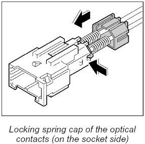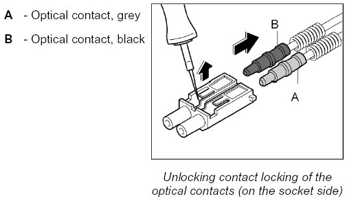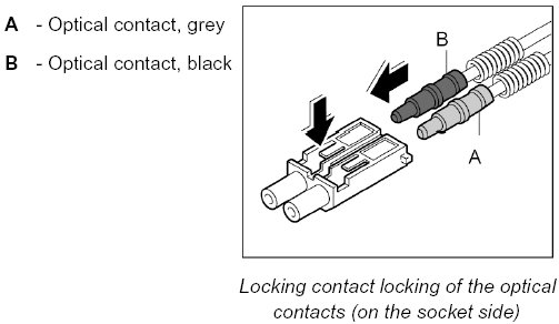 The LWL is delivered with affixed plastic contacts. These contacts are latched in the connector housing in the case of repairs. Grey and black contacts with identical mechanical dimensions are used.