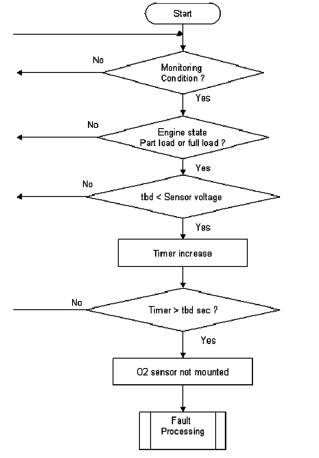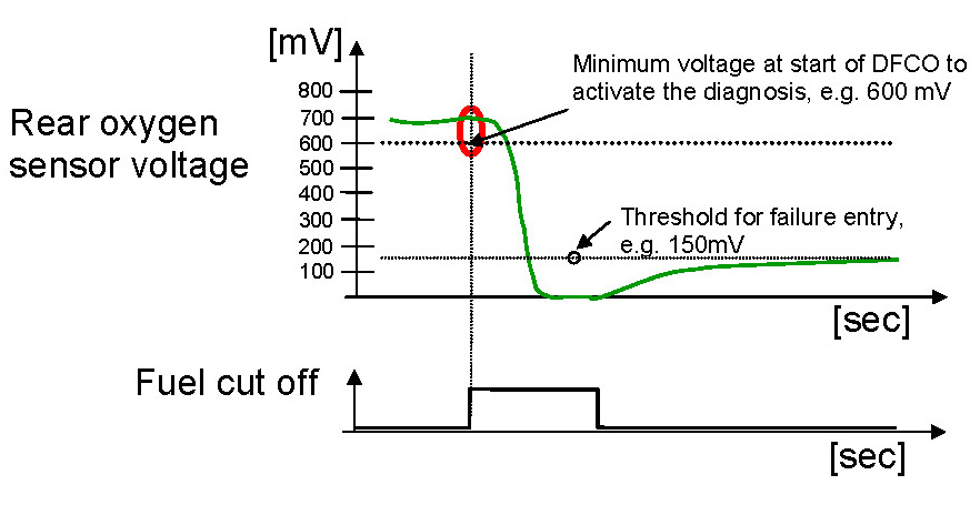 1. Part one monitors the downstream sensor voltage during active fuel trim controller p-share. If the fuel trim control is active, the downstream sensor voltage must be in a band around the trim control set point. If the voltage is outside this band, a mass air flow integral is incremented. If this integral is over a threshold, a malfunction is detected (see also picture below.). When the downstream sensor voltage will not switch to rich before the integral is over a threshold after a fuel cut-off phase, then this fault will be stored, too.