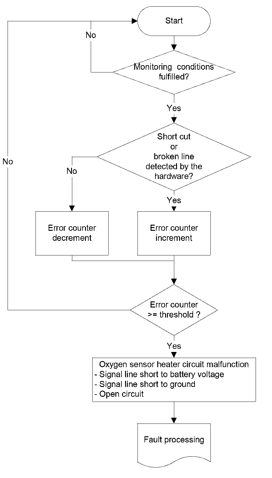 An open circuit in line Virtual Ground or in the line Pumping current can be detected if the sensor signal sticks near lambda 1. The sensor non-activity can be detected by the Oxygen Sensor Signal Monitoring During Fuel Cut-off (signal voltage below e.g. 2,1 V) in fuel cut off or WRAF sens activity check.
