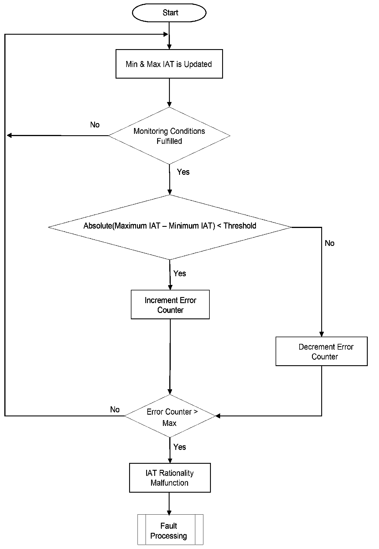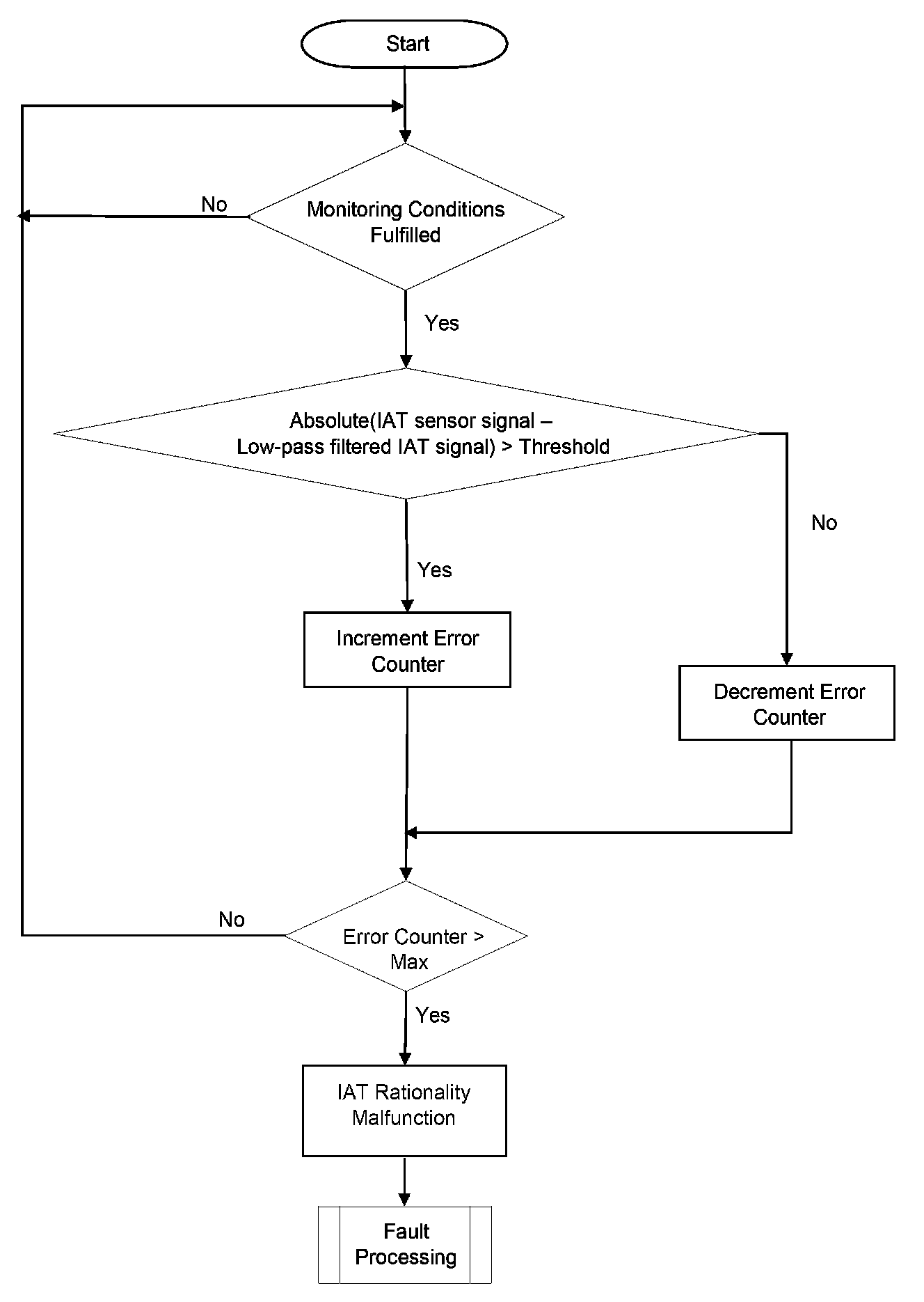 This diagnosis checks IAT for a Stuck signal. If the vehicle was driven for a minimum required distance and time-after-start, then the change in the IAT signal during this period should be above a calibrate able threshold. If this is not the case, a stuck IAT signal is detected.