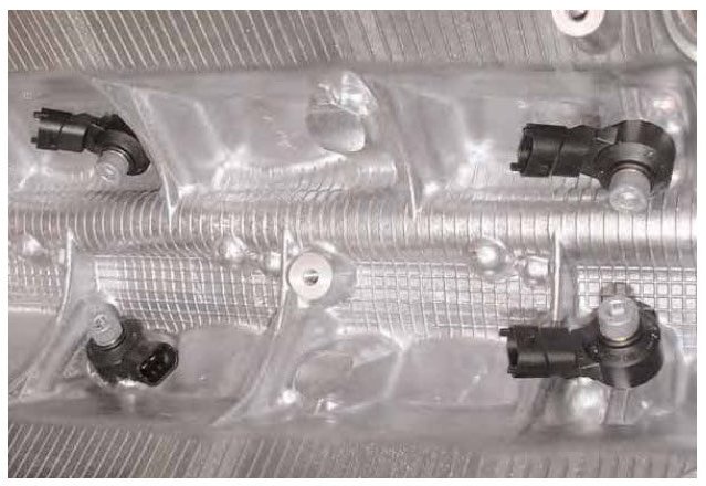 All V8 DFI engines have four knock sensors arranged in the V of the engine block. These four knock sensors are required for exact knock detection in V8 DFI engines since stronger vibrations are transmitted to the cylinder head via the fuel injectors during high pressure fuel injection.