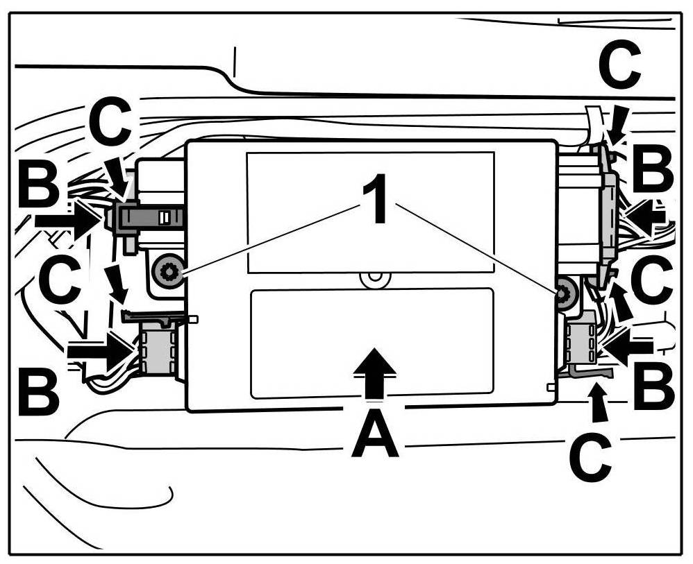 2. Push in the connectors -arrows B- until the locking tabs -C- are felt to engage.