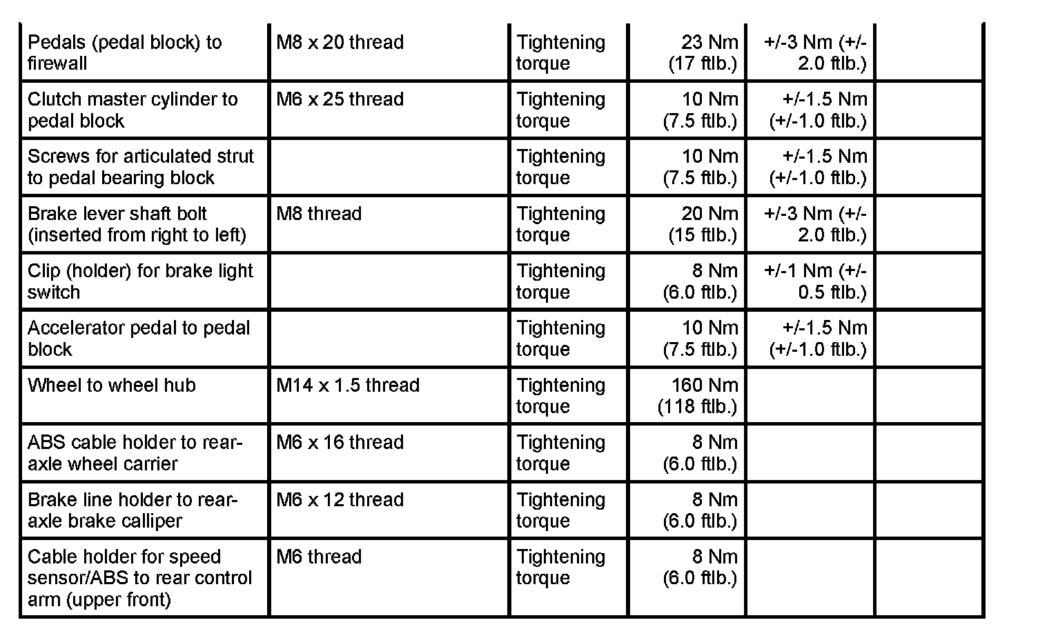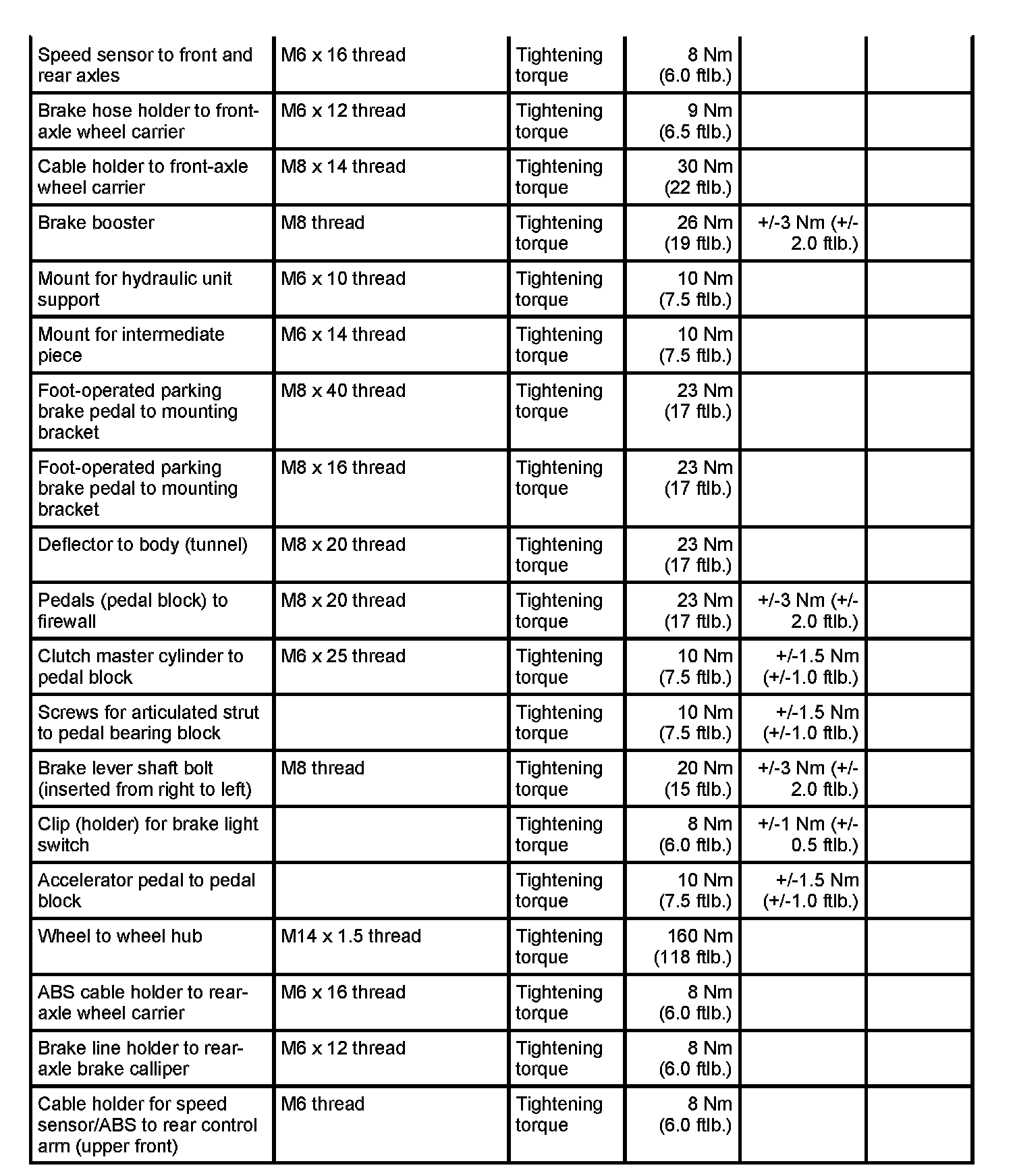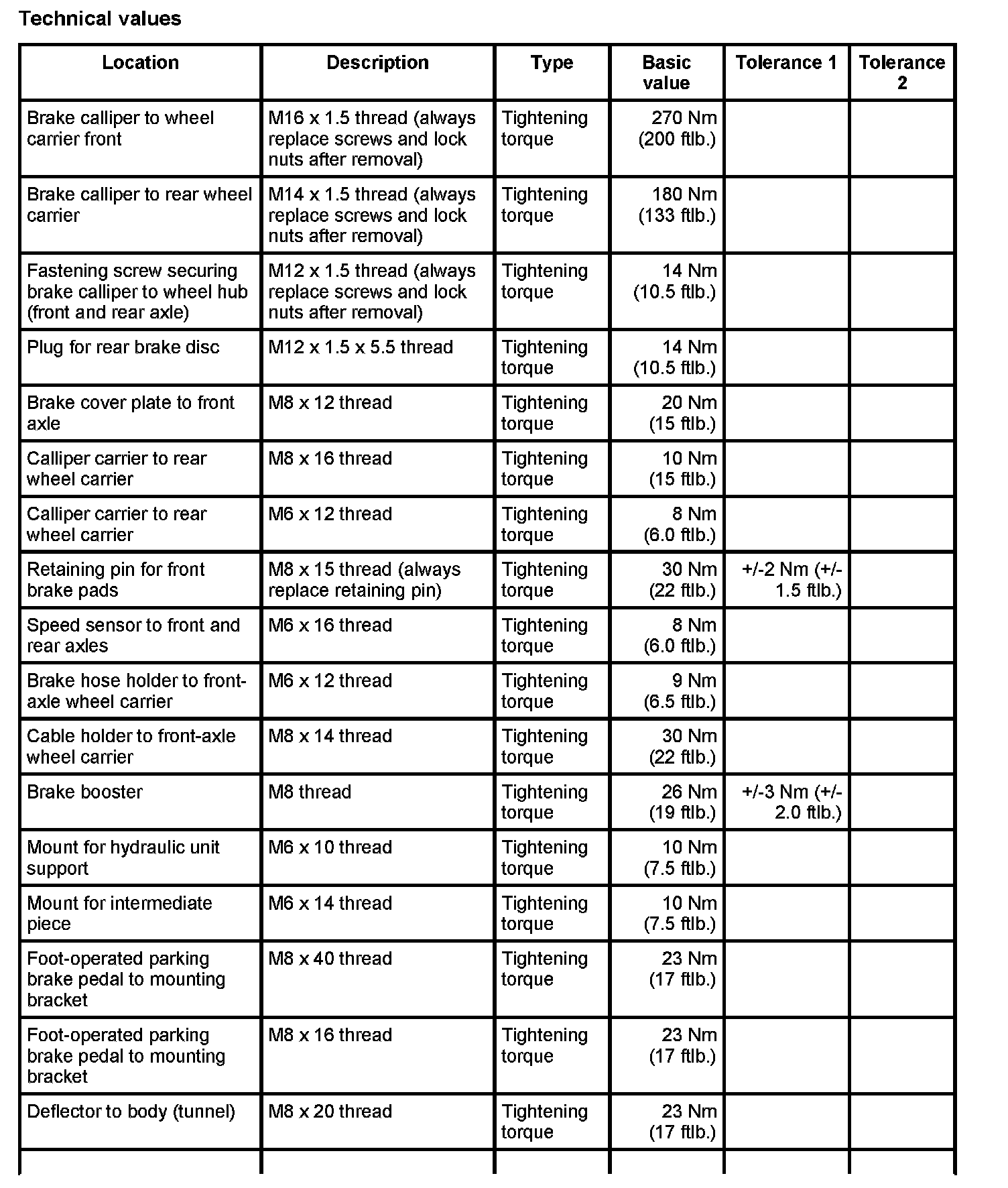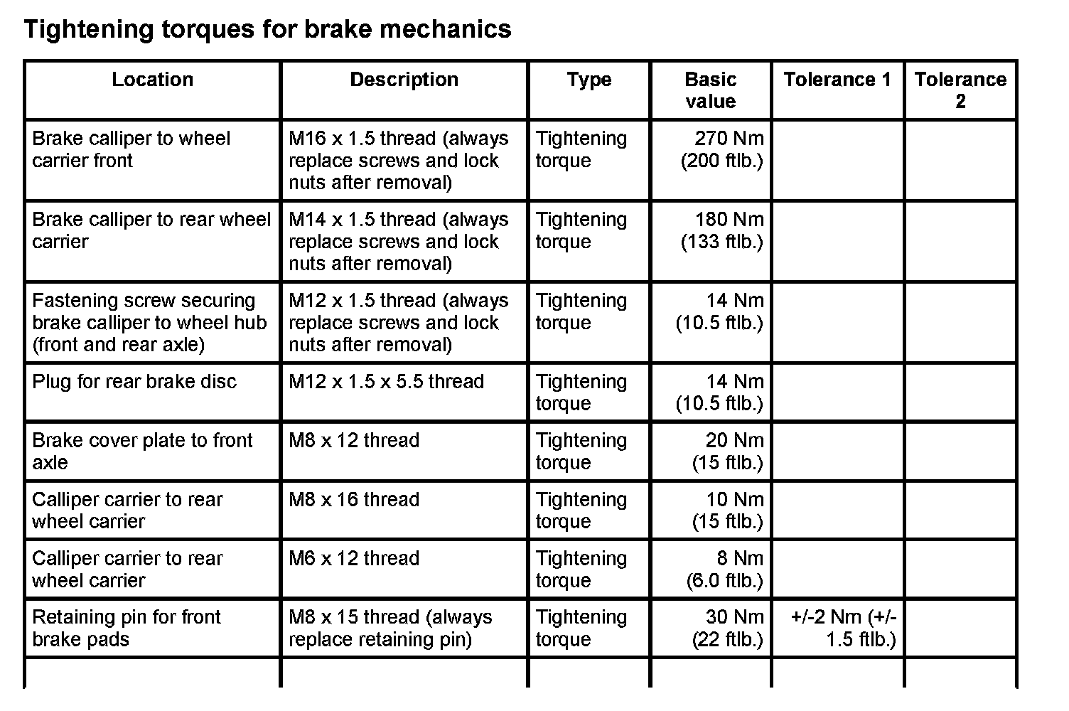 Tightening torques for brake mechanics