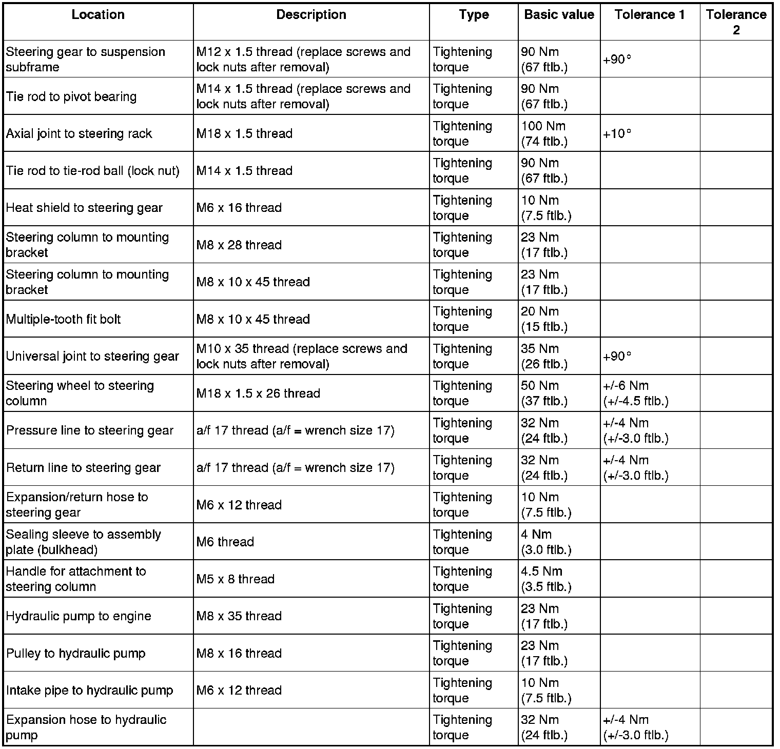 Tightening torques