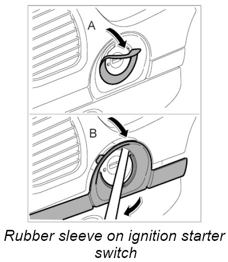 1. Carefully lift rubber sleeve on the ignition starter switch -arrow A- using a screwdriver, for example, and remove it.