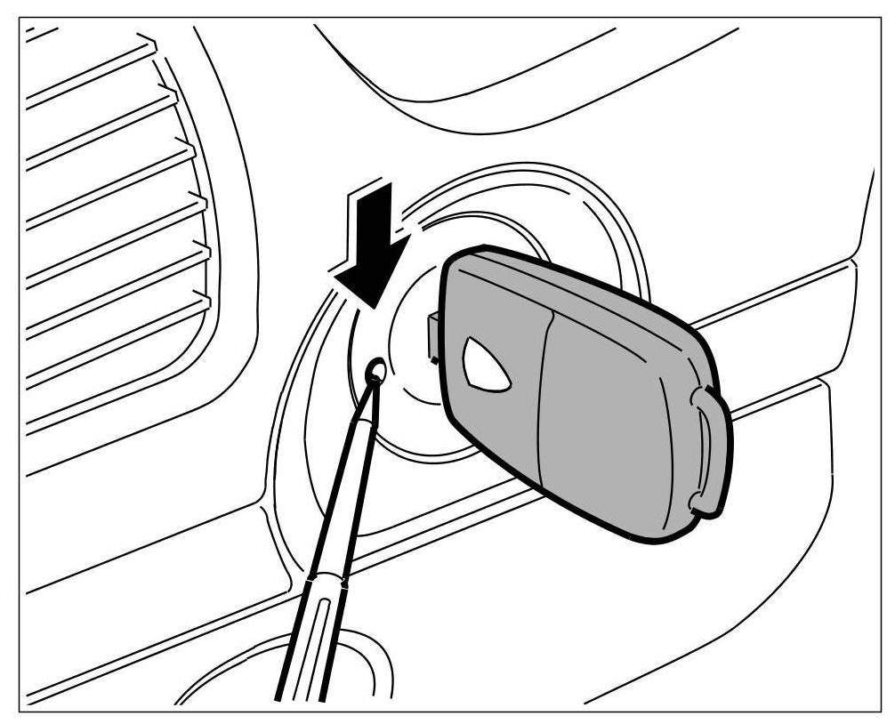 1. Push a ball-point pen, for example, into the opening next to the key, turn the ignition key to position 0 and pull out.
