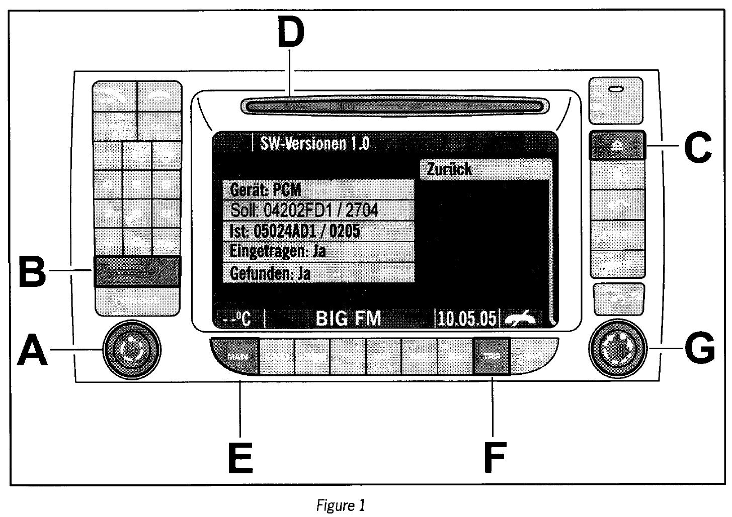 3.2 Insert the PCM2.1 update CD Model Level B (Part No. 000.043.205.47.002) into the CD slot --> Figure 1 -D-. The software update starts automatically.